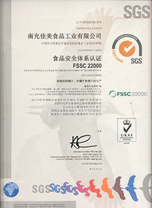 南充佳美于2018年取得了FSSC 22000食品安全體系認(rèn)證證書(shū)。
